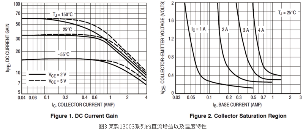 3.功率BJT的hFE是正溫特性,當IC=0.7A左右的時候,高溫時會增加25%左右(如圖3所示),因此,溫度越高,同等驅動電流(芯片驅動電流接近零溫)情況下的VCE會越低,導通損耗越小。