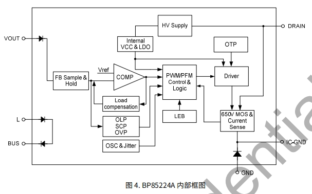 高壓MOSFET:內(nèi)部集成650V高壓MOSFET,減少外部元件數(shù)量。