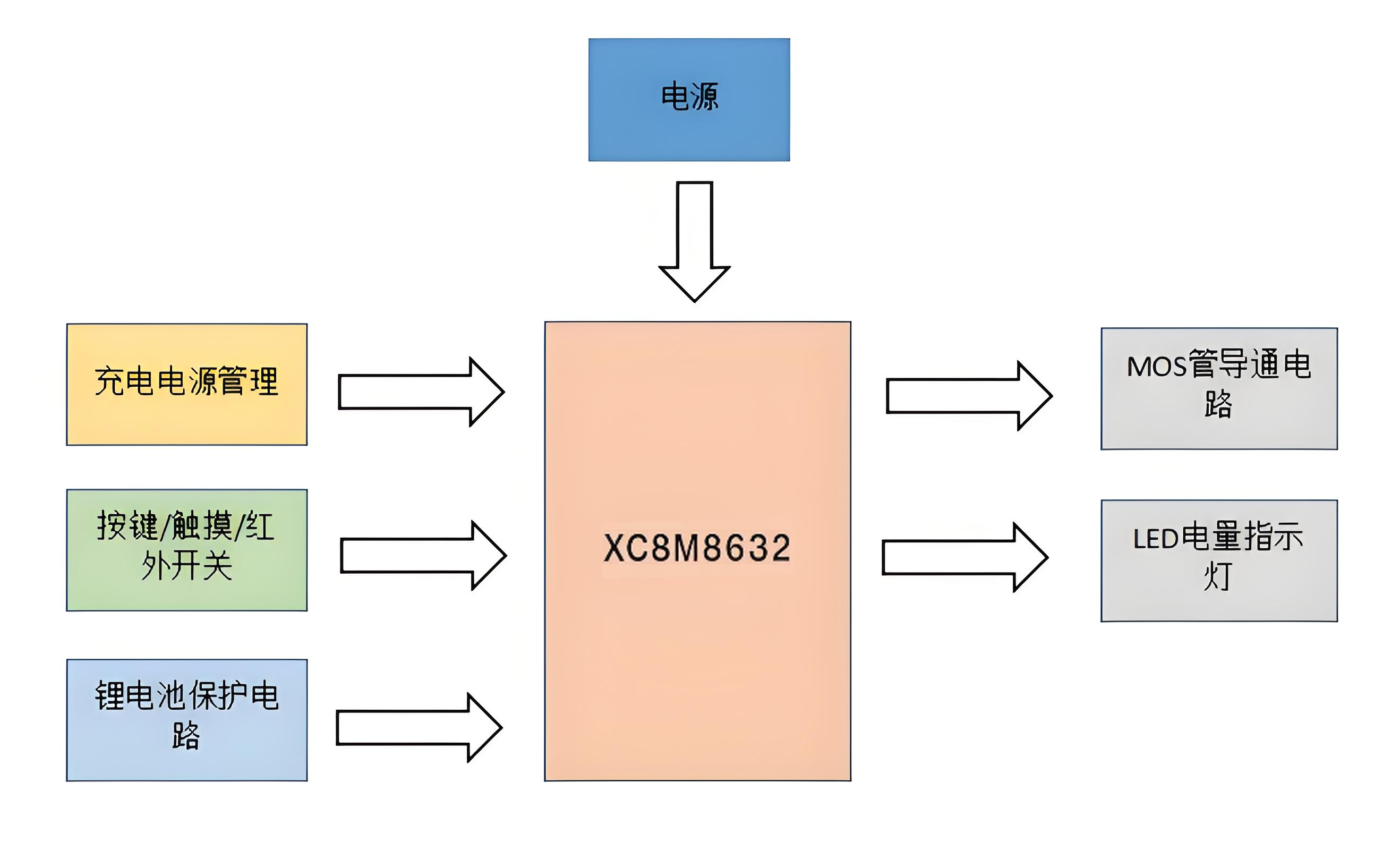 在本方案中,主控電弧打火機芯片采用矽杰微單片機XC8M8632,支持定制開發(fā)(比如:觸摸開關(guān)、紅外開關(guān)、電量顯示等),該點煙器芯片主要負(fù)責(zé)功能如下:
