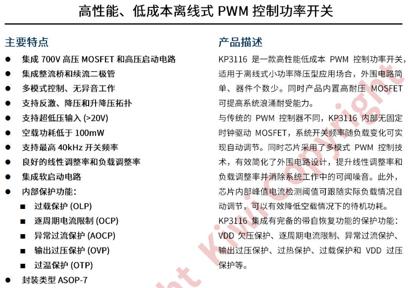 KP3116WPA 把“高壓 MOS + 高壓啟動 + 多模式 PWM”一口氣塞進 SOP-7,外圍僅 8 顆料,空載 <100 mW,系統(tǒng)成本 <0.45 元,PCB 1 cm2 搞定。看完這篇,你會明白什么叫“一粒米”電源。
