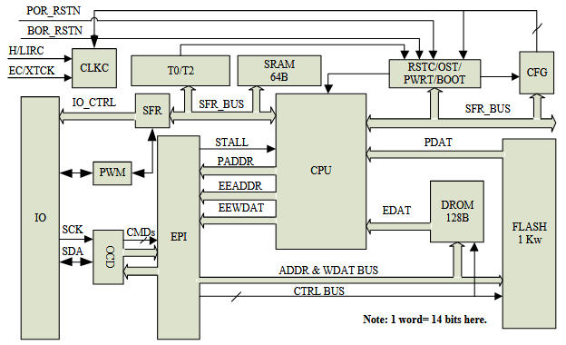 HIRC/LIRC → 時鐘選擇器 → CPU/Timer/PWM → GPIO → 外部世界