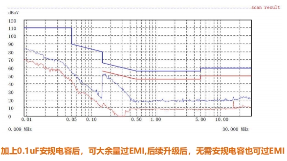 YD925在半波整流+0.1μF電容條件下即可通過EMI測試,無需額外共模電感,進(jìn)一步壓縮成本和體積。