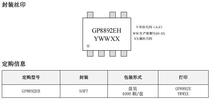 GP8892EH:管腳2為NC(懸空),管腳4為VCC(與3腳并聯(lián)),管腳7為GND