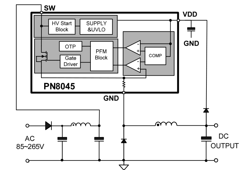 PN8045集成PFM控制器及650V高雪崩能力智能功率MOSFET,用于外圍元器件較簡(jiǎn)的小功率非隔離開(kāi)關(guān)電源。PN8045內(nèi)置啟動(dòng)模塊,實(shí)現(xiàn)系統(tǒng)啟動(dòng)、待機(jī)功能。該芯片提供了智能化保護(hù)功能,包括過(guò)載保護(hù),欠壓保護(hù),過(guò)溫保護(hù)。另外PN8045的降頻調(diào)制技術(shù)有助于EMI特性。