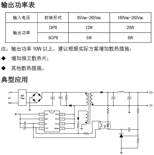 輸出功率 DIP8 ,(85Vac~265Vac)12W;   (180Vac~265Vac)24W
