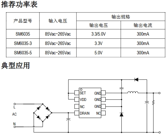 SM6035-X 是一款高精度非隔離、高集成度且低成本的降壓恒壓控制芯片,適用于 85Vac~265Vac 全電壓范圍應用;SM6035-X 內(nèi)部集成500V高壓功率管,內(nèi)置 CS 電阻,無需外部補償元件,即可實現(xiàn)優(yōu)異的線性調(diào)整率和負載調(diào)整率,外圍元件極少,大大的降低了系統(tǒng)的成本,節(jié)約了PCB的尺寸。SM6035-X 應用于多種供電電源領域,提供3.3/5V 兩種規(guī)格輸出電壓。同時芯片集成有完備的保護功能,過溫保護、過壓保護、欠壓保護等,保證了系統(tǒng)的可靠性。