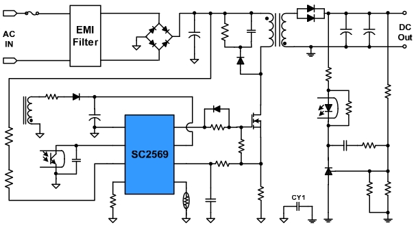 SC2569 是高度集成的電流模式 PWM 電源控制芯片。SC2569 空載時工作在間歇模式降